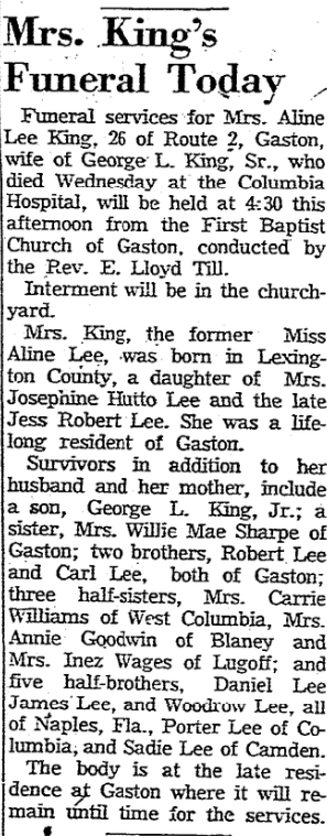 Survivors, in addition to her husband and her mother include one son, George L. King, Jr.; one sister, Mrs. Willie Mae Sharpe of Gaston; two brothers, Robert Lee and Carl Lee, both of Gaston; three half-sisters, Mrs. Carrie Williams of West Columbia, Mrs. Annie Goodwin of Blaney, and Mrs. Inez Wages of Lugoff; and five half-brothers, Daniel Lee, James Lee, and Woodrow Lee, all of Naples, Fla., Porter Lee of Columbia, and Sadie Lee of Camden.