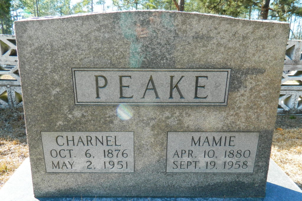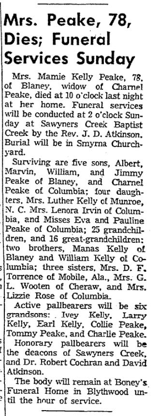 Mrs. Mamie Kelly Peake, 78, of Blaney, widow of Charnel Peake, died at 10 o’clock last night, September 19, 1958 at her home. Funeral services will be conducted at 2 o’clock Sunday at Sawyners Creek Baptist Creek by the Rev. J. D. Atkinson. Burial will be in Smyrna Churchyard.