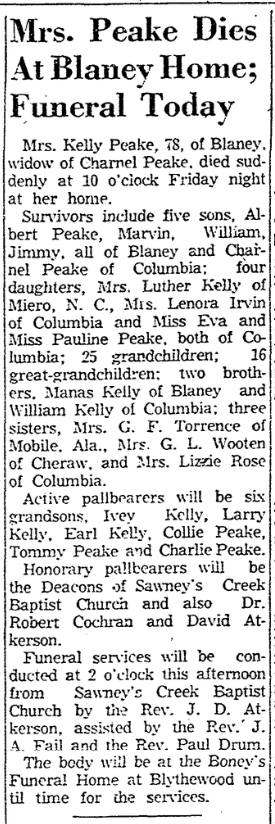 Surviving are five sons, Albert Peake, Marvin Peake, William Peake, and Jimmy Peake of Blaney, and Charnel Peake of Columbia; four daughters, Mrs. Luther Kelly of Munroe, N. C., Mrs. Lenora Irvin of Columbia, and Misses Eva and Pauline Peake of Columbia; 25 grandchildren, and 16 great-grandchildren: two brothers, Manas Kelly of Blaney and William Kelly of Columbia; three sisters, Mrs. D. F. Torrence of Mobile, Ala., Mrs. G. L. Wooten of Cheraw, and Mrs. Lizzie Rose of Columbia.