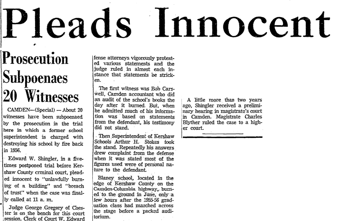 Edward W. Shingler, in a five-times postponed trail before Kershaw County criminal court, pleaded innocent to “unlawfully buring of a building” and “breach of trust” when the case was finally called at 11 a.m.