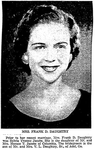 Prior to her marriage, Mrs. Frank D. Daughtry was Sylvia Yvonne Jacobs. She is the daughter of Mr. and Mrs. Horace T. Jacobs (Clara Mae Kizer) of Columbia. The bridegroom is the son of Mr. and Mrs. V. L. Daughtry, Sr., of Adel, Ga.