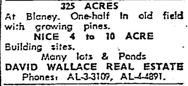 325 ACRES At Blaney. One-half in old field with growing pines. NICE 4 to 10 Acre Building sites. Many lots & Ponds DAVID WALLACE REAL ESTATE Phones: AL-3-3109, AL-4-4891 Continue reading Farm and Acreage