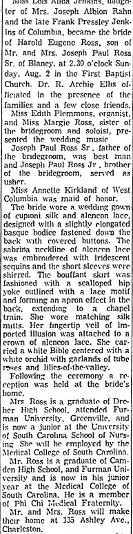 MRS HAROLD EUGENE ROSS Mrs. Harold Eugene Ross was Lois Alida Jenkins before her wedding at 2:30 p.m. August 2 in the First Baptist Church. She is the daughter of Mrs. Joseph Albion Rahn of Columbia and the late, Frank Pressley Jenkins. The bridegroom is the son of Mr. and Mrs. J. Paul Ross, Sr. (Lillian Carrie Hair Ross), of Blaney. Continue reading Summer Wedding and Engagements of Wide Interest