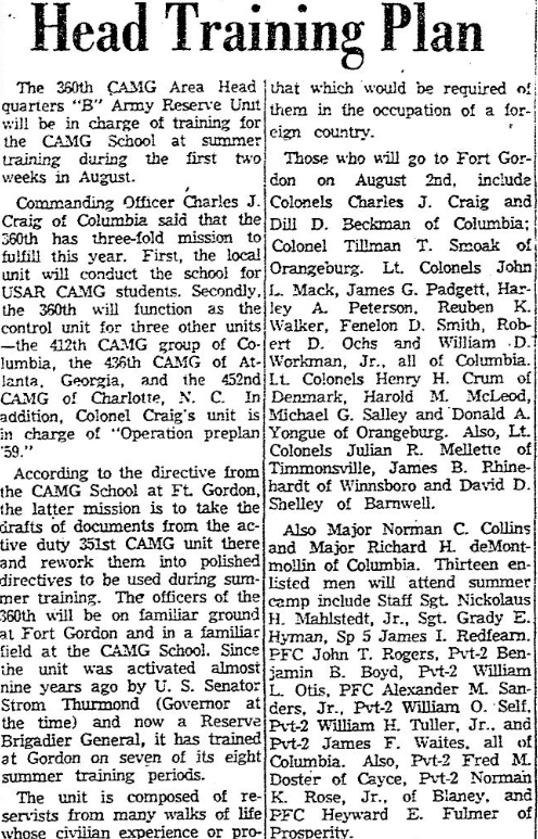 Columbia Reserves Head Training Plan The 360th CAMG Area Head quarters “B” Army Reserve Unit will be in charge of training for the CAMG School at summer training during the first two weeks in August. Commanding Officer Charles J. Craig of Columbia said that the 360th has three-fold mission to fulfill this year. First, the local unit will conduct the school for USAR CAMG students. … Continue reading At Fort Gordon