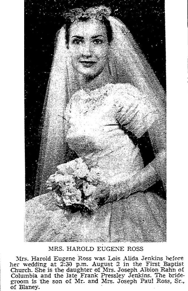 Mrs. Harold Eugene Ross was Lois Alida Jenkins before her wedding at 2:30 p.m. August 2 in the First Baptist Church. She is the daughter of Mrs. Joseph Albion Rahn of Columbia and the late, Frank Pressley Jenkins. The bridegroom is the son of Mr. and Mrs. J. Paul Ross, Sr. (Lillian Carrie Hair Ross), of Blaney.