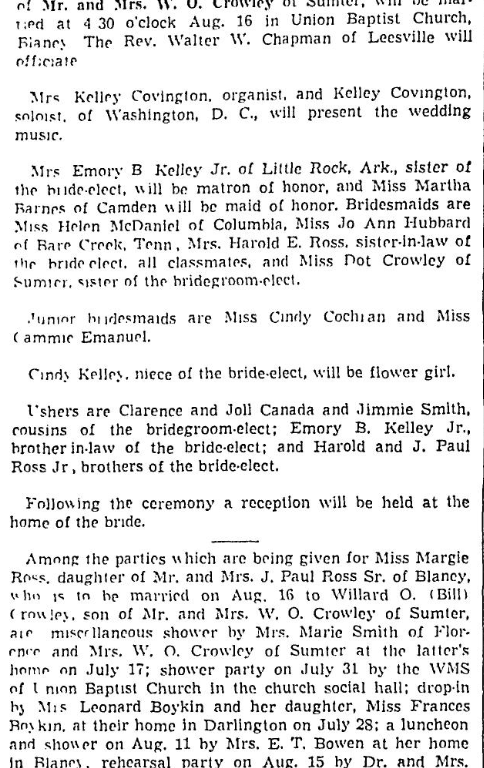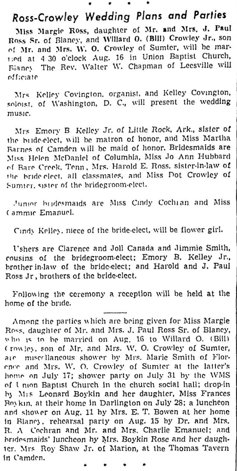 Amoun the parties which are being given for Miss Margie Ross, daughter of Mr. and Mrs. J. Paul Ross. Sr. of Blaney, who is to be married on Aug. 16 to Willard O. (Bill) Crowley, son of Mr. and Mrs. W. O. Crowley of Sumter, are miscellaneous shower by Mrs. Marie Smith of Florence and Mrs. W. O. Crowley of Sumter at the latter’s home on July 17; shower party on July 31 by the WMS of Union Baptist Church in the church social hall; drop-in by Miss Leonard Boykin and her daughter, Miss Frances Boykin, at their home in Darlington on July 28; a luncheon and shower on Aug. 11 by Mrs. E. T. Bowen at her home on Blaney, rehearsal party on Aug. 15. by Dr. and Mrs. R. A. Cochran and Mr. and Mrs. Charlie Emanuel; and bridesmaids’ luncheon by Mrs. Boykin Rose and her daughter, Mrs. Roy Shaw Jr. of Marion, at the Thomas Tavern in Camden.