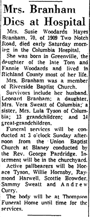 Mrs. Susie Woodards Hayes Branham, 70, of 1909 Two Notch Road, died early Saturday morning in the Columbia Hospital.