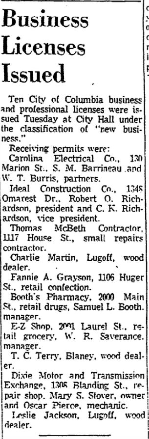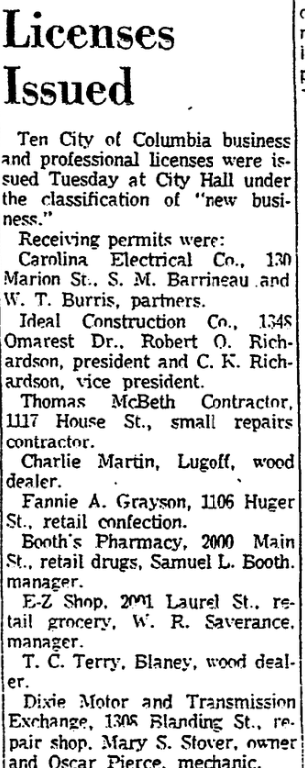 Dixie Motor and Transmission Exchange, 1308 Blanding St., repair shop, Mary S. Stover, owner and Oscar Pierce, mechanic.