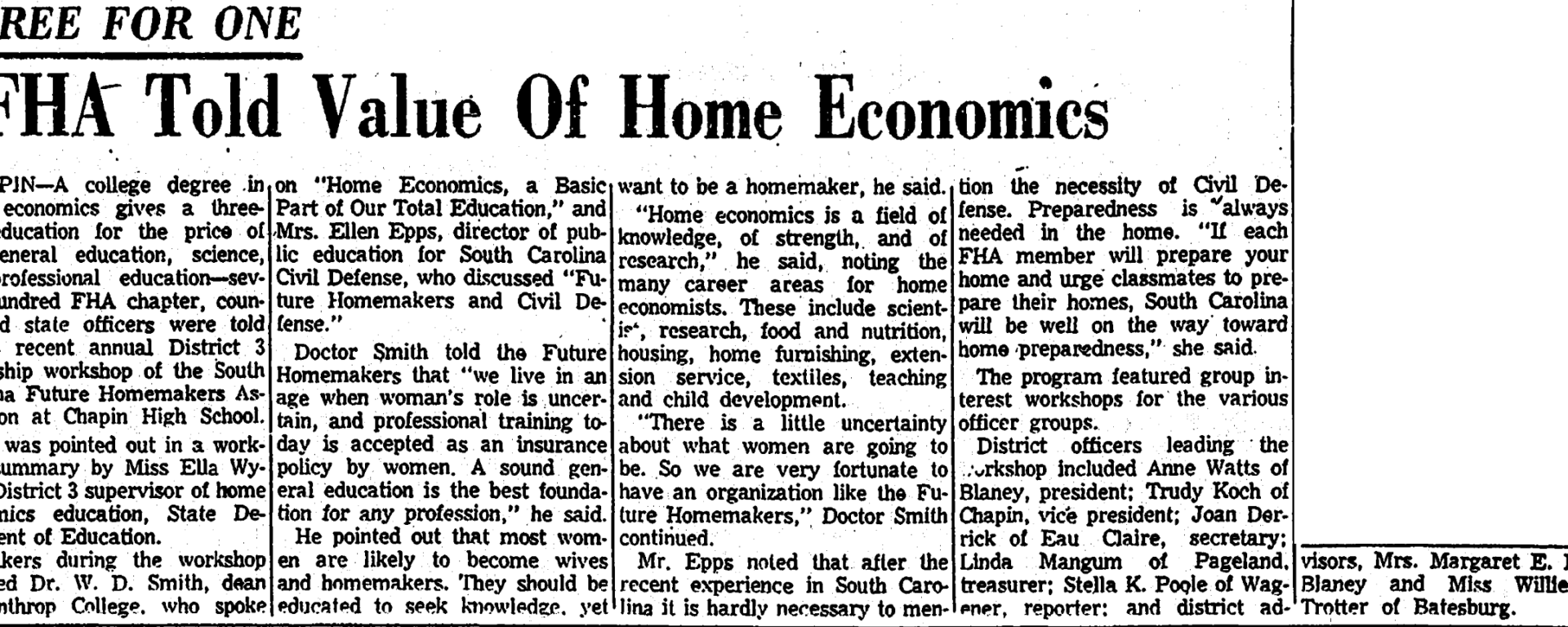 Speakers during the workshop included Dr. W. D. Smith, dean of Winthrop College, who spoke on “Home Economics, a Basic Part of Our Total Education,” and Mrs. Ellen Epps, director of public education for South Carolina Civil Defense, who discussed “Future Homemakers and Civil Defense.”