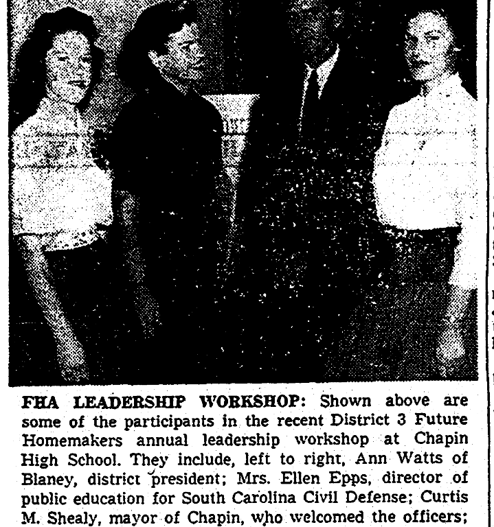 FHA LEADERSHIP WORKSHOP: Shown above are some of the participants in the recent District 3 Future Homemakers annual leadership workshop at Chapin High School. They include, left to right, Ann Watts of Blaney, district president; Mrs. Ellen Epps, director of public education for South Carolina Civil Defense; Curtis M. Shealy, mayor of Chapin, who welcomed the officers; and Betty Jo Banks, president of the Chapin Chapter of Future Homemakers. (Kent Studio photo)
