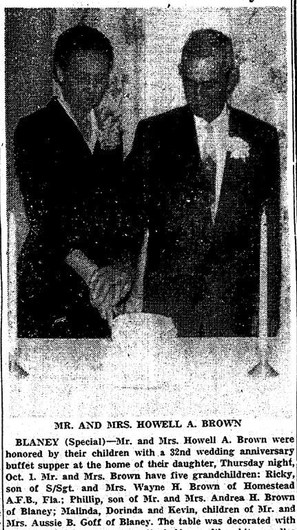 BLANEY (Special) – Mr. and Mrs. Howell A. Brown (Mamie Jeffers Brown) were honored by their children with a 32nd wedding anniversary buffet supper at the home of their daughter, Thursday night, Oct. 1. Mr. and Mrs. Brown have five grandchildren: Ricky Brown, son of S/Sgt. and Mrs. Wayne H. Brown of Homestead A. F. B., Fla.; Phillip Brown, son of Mr. and Mrs. Andrea H. Brown of Blaney; Malinda Goff, Dorinda Goff and Kevin Goff, children of Mr. and Mrs. Aussie B. Goff (Leverda Brown Goff) of Blaney. The table was decorated with a lace tablecloth, silver candle holders with white candles and a beautiful green and white tiered wedding cake.
