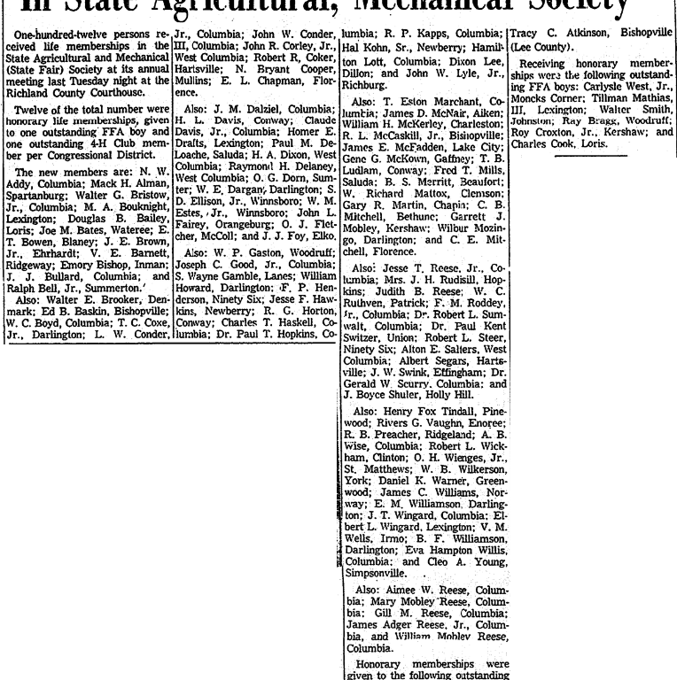 Also, W. P. Gaston, Woodruff; Joseph C. Good, Jr., Columbia; S. Wayne Gamble, Lanes; William Howard, Darlington; F. P. Henderson, Ninety Six; Jesse F. Hawkins, Newberry; R. G. Horton, Conway; Charles T. Haskell, Columbia; Dr. Paul T. Hopkins, Columbia; R. P. Kapps, Columbia; Hal Kohn, Sr., Newberry; Hamilton Lott, Columbia: Dixon Lee, Dillon; and John W. Lyle, Jr., Richburg.