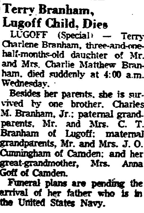 Terri Charlene Branham, three-and-one-half-months-old, of Lugoff, died suddenly at 4:00 a.m. Wednesday, February 24, 1960.