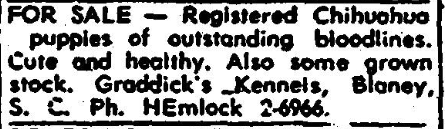 FOR SALE – Registered Chihuahua puppies of outstanding bloodlines. Cute and healthy. Also some grown stock. Graddick’s Kennels, Blaney, S. C. Ph. HEmlock 2-2966