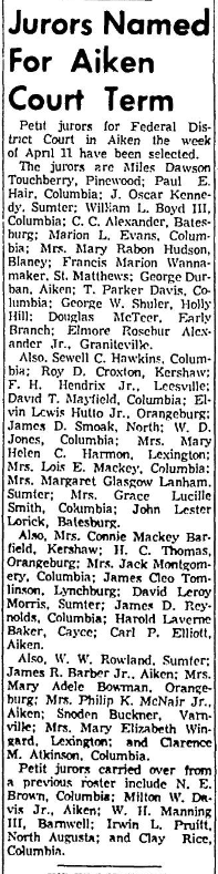 The jurors are Miles Dawson Touchberry, Pinewood; Paul E. Hair, Columbia; J. Oscar Kennedy, Sumter; William L. Boyd III, Columbia; C. C. Alexander, Batesburg; Marion L. Evans, Columbia; Mrs. Mary Rabon Hudson, Blaney; Francis Marion Wannamaker, St. Matthews; George Durban, Aiken; T. Parker Davis, Columbia; George W. Shuler, Holly Hill; Douglas McTeer, Early Branch; Elmore Rosebur Alexander, Jr., Graniteville.