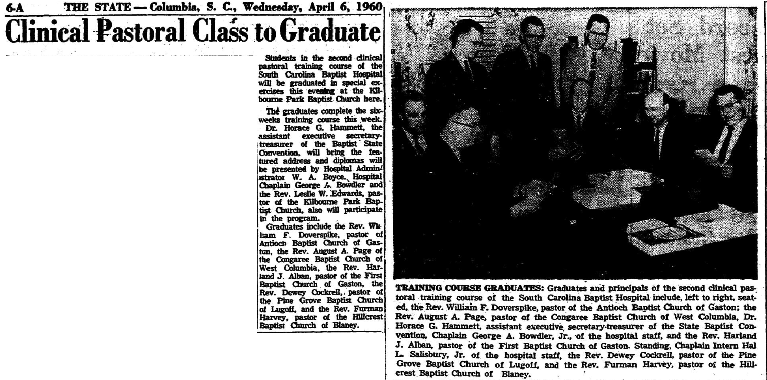TRAINING COURSE GRADUATES: Gradutes and principals of the second clinical pastoral training course of the South Carolina Baptist Hospital include, left to right, seated, the Rev. William F. Doversike, pastor of the Antioch Baptist Church of Gaston; the Rev. August A. Page, of the Congaree Baptist Church of West Columbia, Dr. Horace G. Hammett, assistant executive secretary-treasure of the State Baptist Convention, Chaplin George A. Bowdler, Jr., of the hospital staff, and the Rev. Harland J. Alban, pastor of the First Baptist Church of Gaston. Standing, Chaplin Intern Hal L. Salisbury, Jr. of the hospital stoff, the Rev. Dewey Cockrell, pastor of the Pine Grove Baptist Church of Lugoff, and the Rev. Furman Harvey, pastor of the Hillcrest Baptist Church of Blaney.