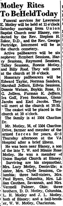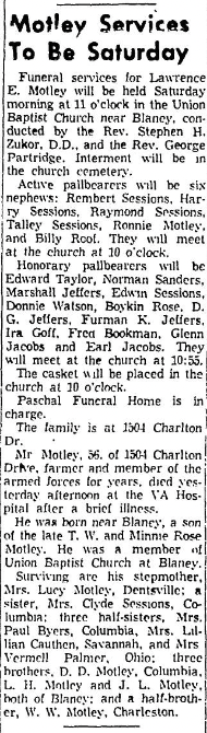 Funeral services for Lawrence E. Motley will be at 11 o’clock Saturday morning from Union Baptist Church near Blaney, conducted by the Rev. Stephen H. Zukor, D. D., and the Rev. George Partridge. Interment will be in the church cemetery.