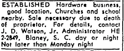 ESTABLISHED Hardware business, good location. Churches and school nearby. Sale necessary due to death of proprietor. For details, contact J. D. Watson, Jr. Administrator HE 2-2849, Blaney, S. C. day or night. Not later than Monday night.