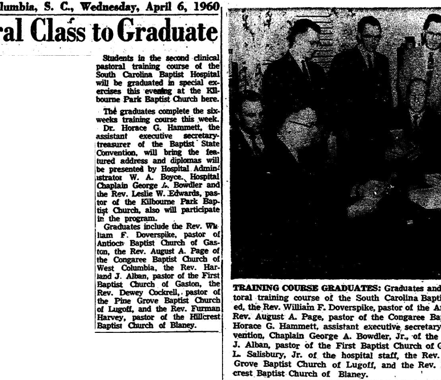 Students in the second clinical pastoral training course of the South Carolina Baptist Hospital will be graduated in special exercises this evening at the Kilbourne Park Baptist Church here. The graduates complete the six-weeks training course this week. Dr. Horace G. Hammett, the assistant executive secretary-treasurer of the Baptist State Convention, will bring the featured address and diplomas will be presented by Hospital Administrator W. … Continue reading Clinical Pastoral Class to Graduate