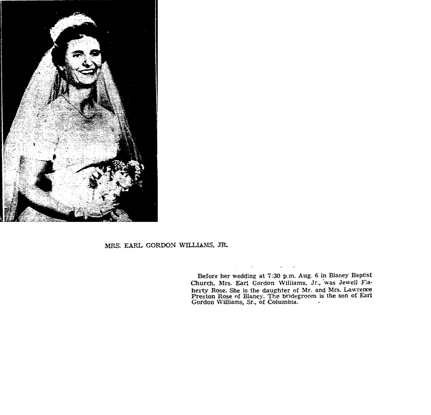 Before her wedding at 7:30 p.m. Aug. 6 in Blaney Baptist Church, Mrs. Earl Gordon Williams, Jr., was Jewell Flaherty Rose. She is the daughter of Mr. and Mrs. Lawrence Preston Rose of Blaney. The bridegroom is the son of Earl Gordon Williams, Sr., of Columbia.
