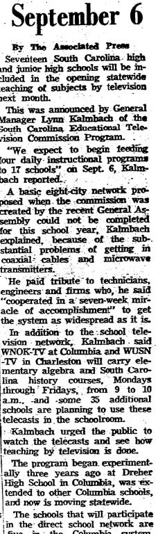 In addition to the school television network, Kalmbach said WNOK-TV at Columbia and WUSN-TV in CHarleston will carry elementary algebra and South Carolina history courses, Monday through Fridays, from 9 to 10 a.m., and some 35 additional schools are planning to use these telecast in the schoolroom.