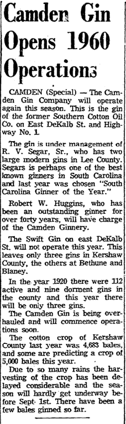 The Swift Gin on east DeKalb St. will not operate this year. This leaves only three gins in Kershaw County, the others at Bethune and Blaney.