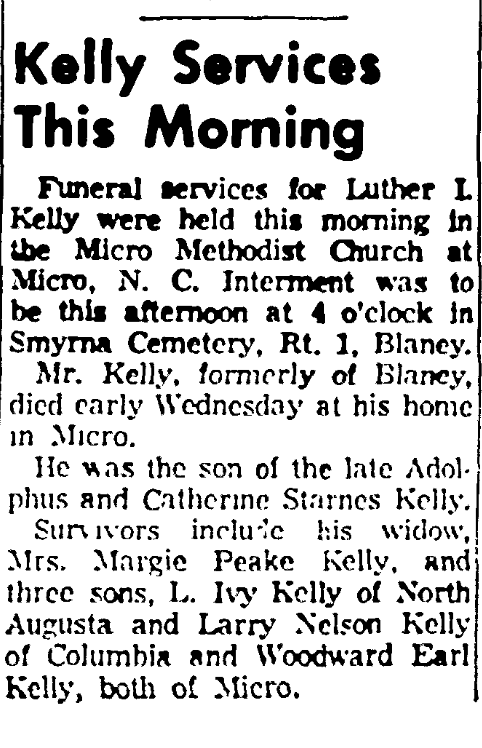 Funeral Services for Luther I. Kelly were held this morning in the Micro Methodist Church at Micro, N. C. Interment was to be this afternoon at 4 o’clock in Smyrna Cemetery, Rt. 1, Blaney.