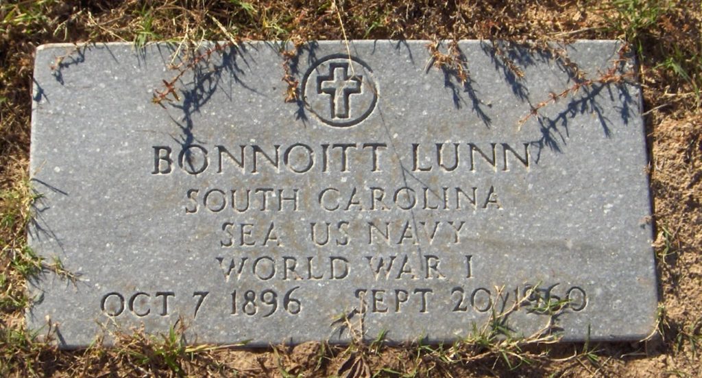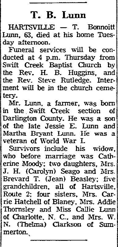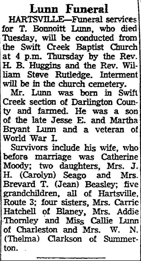 Thomas Bonnoitt Lunn was born in 1897 in Swift Creek section, Darlington, South Carolina, a son of Jessie E. Lunn and Martha Bryant Lunn.