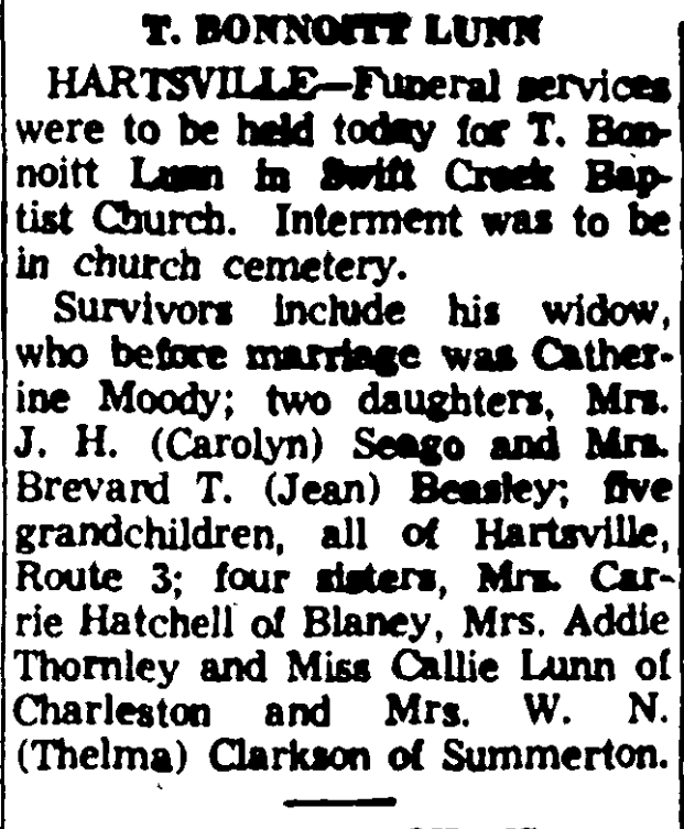 HARTSVILLE – T. Bonnoitt Lunn, 63, died at his home Tuesday afternoon, September 20, 1960.
