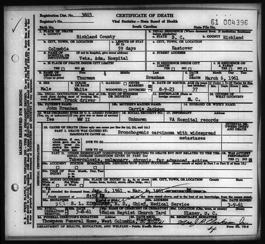 Thurmond Branham, 36, of Eastover, died at the Veterans Hospital at 8:30 a.m. Monday after three months’ illness.