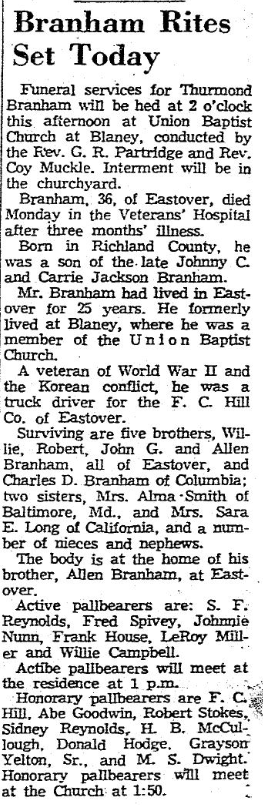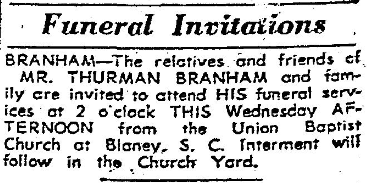 BRANHAM-The relatives and friends of MR. THURMAN BRANHAM and family are invited to attend HIS funeral services at 2 o’cloc THIS Wednesday AFTERNOON from the Union Baptist Church a Blaney, S. C. Interment will follow in the Church Yard.