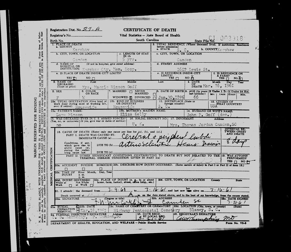 On June 28, 1973, Maggie Hinson was mentioned as the deceased mother in the death record of Linwood John Goff.