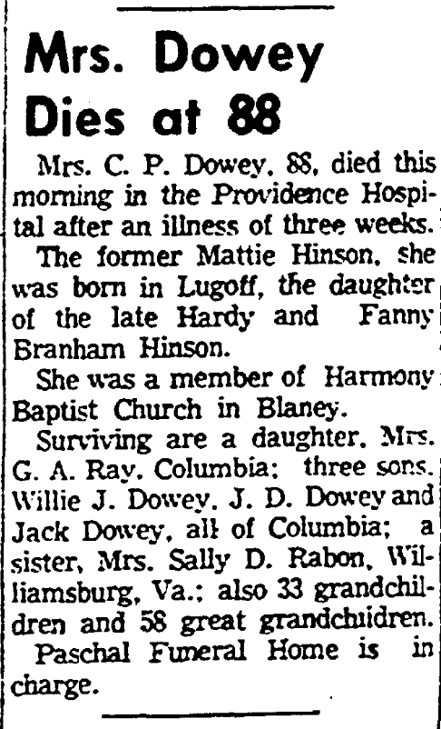 Surviving are a daughter, Mrs. G. A. Ray, Columbia; three sons, Willie J. Dowey, J. D. Dowey and Jack Dowey, all of Columbia; a sister, Mrs. Sally D. Rabon, Williamsburg, Va.; also 33 grandchildren and 58 great grandchildren.