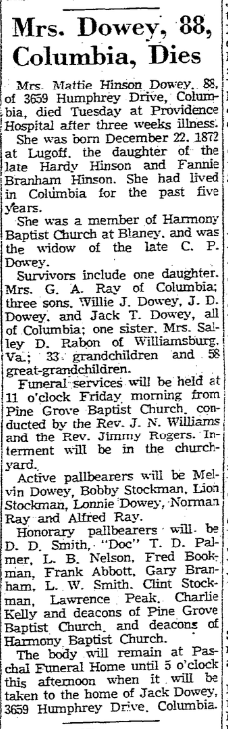 Mrs. C. P. Dowey, 88, of 3659 Humphrey Drive, Columbia, died this morning, August 2, 1961 in the Providence Hospital after an illness of three weeks.