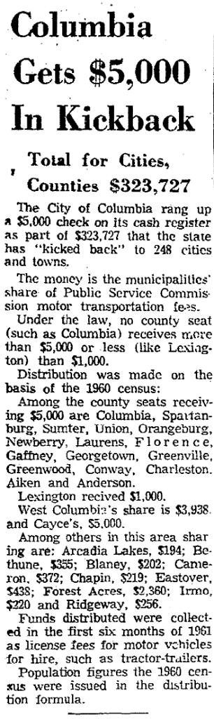 The City of Columbia rang up a $5,000 check on its cash register as part of $323,727 that the state has “kicked back” to 248 cities and towns.