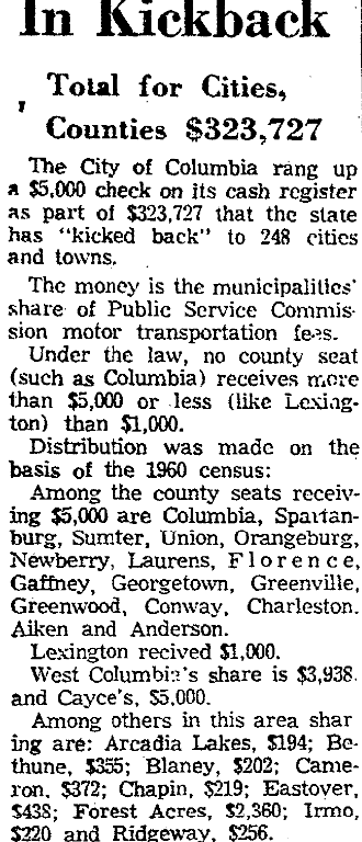Among others in this are sharing are: Arcadia Lakes, $194; Bethune, $355; Blaney, $202; Cameron, $372; Chapin, $219; Eastover, $438; Forest Acres, $2,360; Irmo, $220 and Ridgeway, $256.