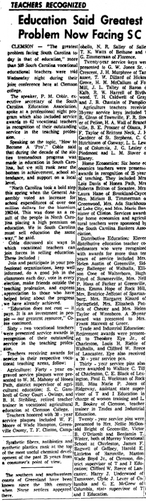 Speaking on the topic, “How to Become a ‘Pro’.” Coble said that during the decade of the sixties tremendous progress was made in education in South Carolina, but we still rank near the bottom in achievement, school attendance, and support on a local level.