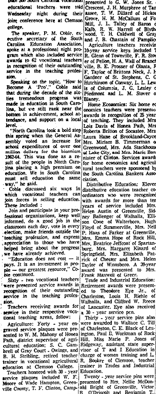 Distributive Education: Eleven distributive education teacher coordinators who were recognized with awards for more than ten years of service included Mrs. Helen Austin of Greenville, Sidney Ballenger of Walhalla, Ellison Cone of Walterboro, Hugh Floyd of Summerville, Mrs. Nell P. Haas of Parker at Greenville, Mrs. Emma Hope of Rock Hill, Mrs. Beatrice Jeffcoat of Spartanburg, Mrs. Elizabeth Patrick of Chester and Mrs. Helen Taylor of Winnsboro. A 20-year award was presented to Mrs. Frank Maxwell of Greer.