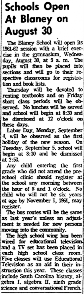 The Blaney School will open its 1961-62 session with a brief exercise in the gymnasium, Wednesday, August 30, at 9 a.m. The pupils will then be placed into sections and will go to their respective classrooms for registration and book lists.