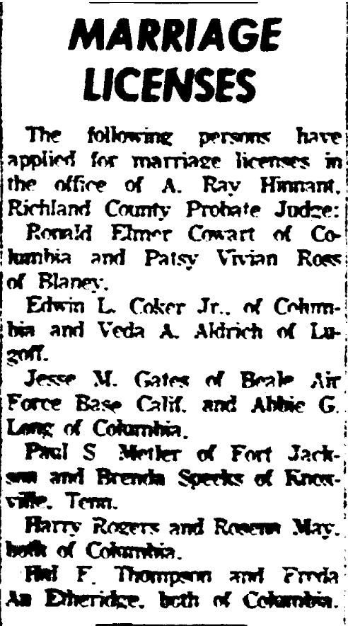 Ronald Elmer Cowart of Columbia and Patsy Vivian Ross of Blaney.