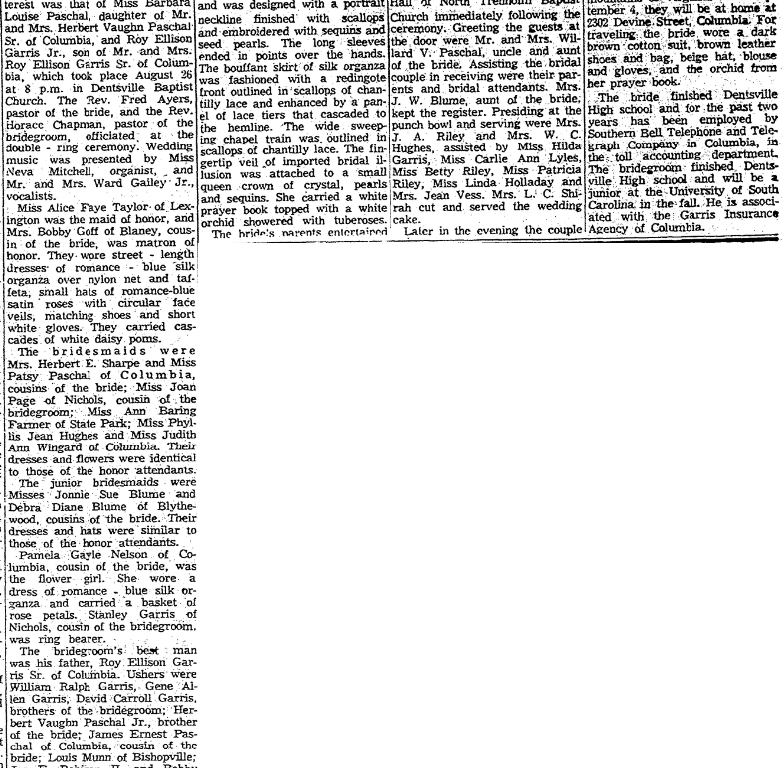 A lovely wedding of wide interest was that of Miss Barbara Louise Paschal, daughter of Mr. and Mrs. Herbert Vaughn Paschal Sr. of Columbia, and Roy Ellison Garris Jr., son of Mr. and Mrs. Roy Ellison Garris Sr., of Columbia, which took place August 26 at 8 p.m. in Dentsville Baptist Church. The Rev. Fred Ayers, pastor of the bride, and the Rev. Horace Chapman, pastor of the bridegroom, officiated at the double-ring ceremony. Wedding music was presented by Miss Neva Mitchell, organist, and Mr. and Mrs. Ward Gailey Jr., vocalists.