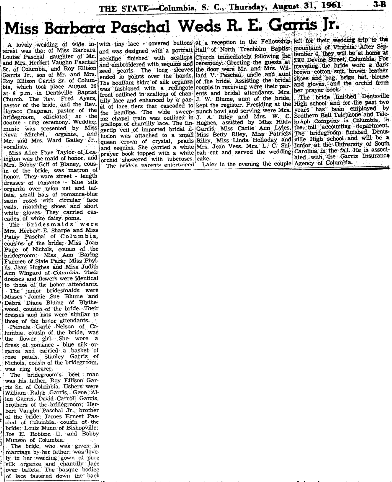 The bridegroom’s best man was his father, Roy Ellison Garris Sr. of Columbia. Usher were William Ralph Garris, Gene Allen Garris, David Carroll Garris, brothers of the bridegroom; Herbert Vaughn Paschal Jr., brother of the bride; James Ernest Paschal of Columbia, cousin of the bride; Louis Munn of Bishopville; Joe E Robison II, and Bobby Munson fo Columbia.