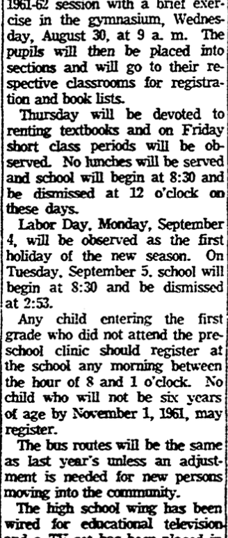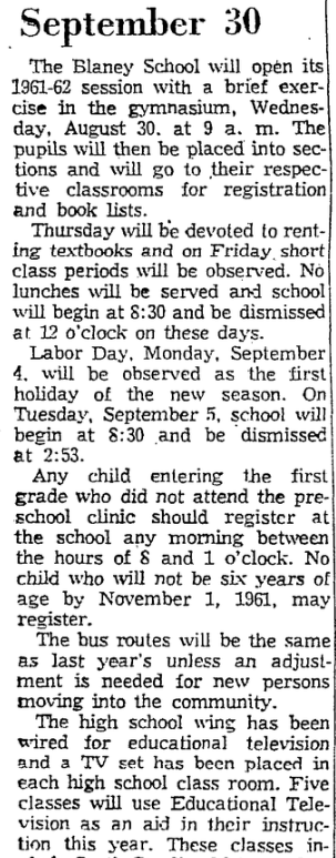 The Blaney School will open its 1961-62 session with a brief exercise in the gymnasium, Wednesday, August 30, at 9 a.m. The pupils will then be placed into sections and will go to their respective classrooms for registration and book lists. Thursday will be devoted to renting textbooks and on Friday short class periods will be observed. No lunches will be served and school will … Continue reading Schools Open At Blaney on August 30