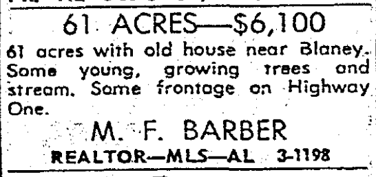 61 acres with old house near Blaney. Some young, growing trees and stream. Some frontage on Highway One.