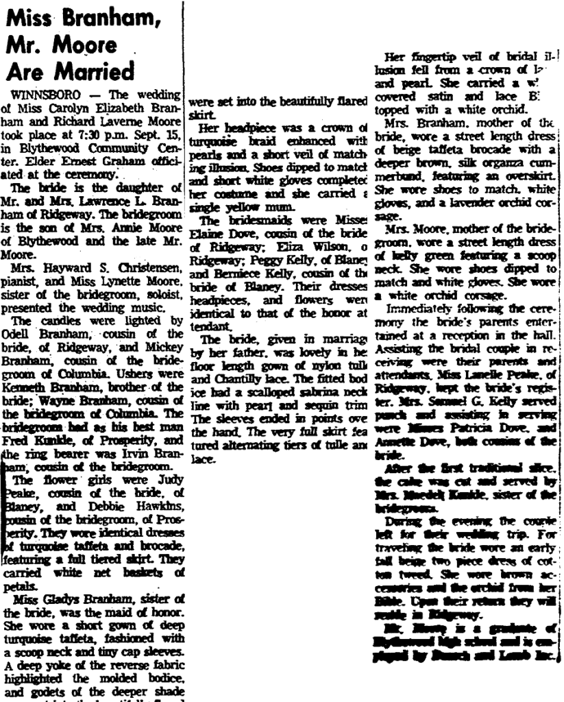 WINNSBORO – The wedding of Miss Carolyn Elizabeth Branham and Richard Laverne Moore, which took place at 7:30 p.m. September 15 in Blythewood Community Center. Elder Ernest Graham officiated at the ceremony.