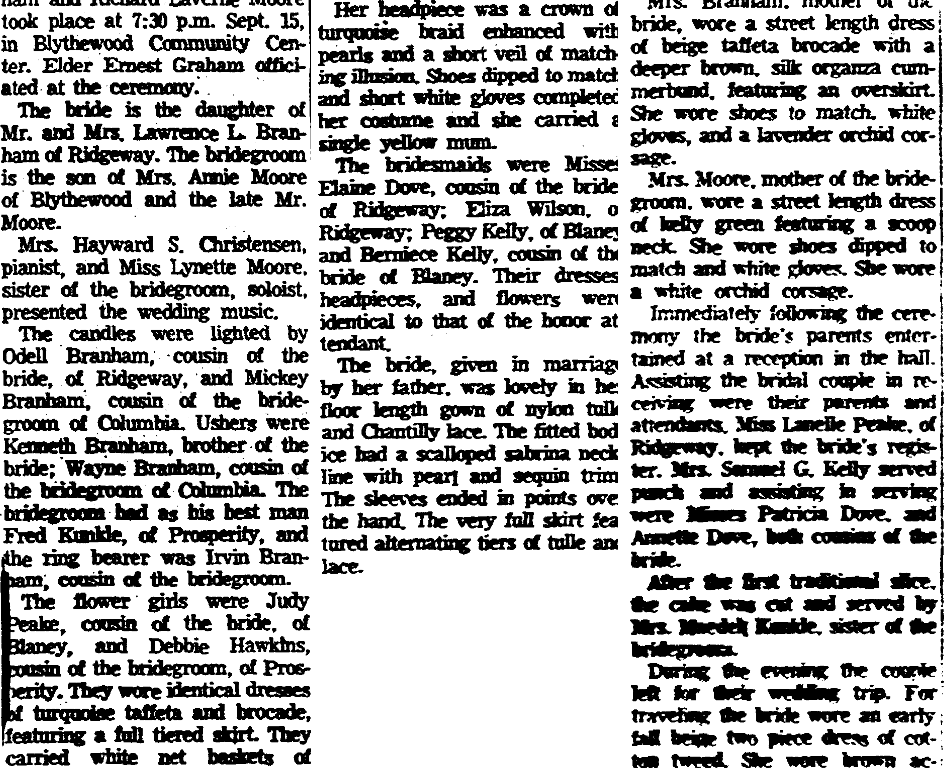 The candles were lighted by Odell Branham, cousin of the bride, of Ridgeway, and Mickey Branham, cousin of the bridegroom, of Columbia. Ushers were Kenneth Branham, brother of the bride; Wayne Branham, cousin of the bridegroom, of Columbia. The bridegroom had as his best man Fred Kunkle, of Prosperity, and the ring bearer was Irvin Branham, cousin of the bridegroom.