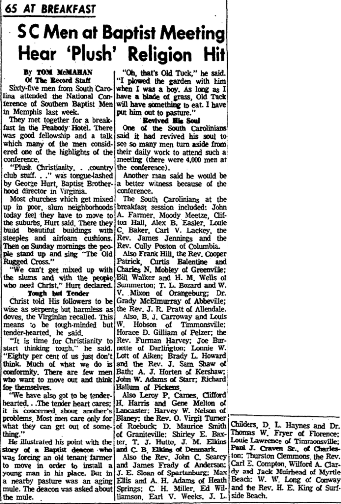 Also, Frank Hill, the Reverend Cooper Patrick, Curtis Balentine and Charles N. Mobley of Greenville; Bill Walker & H. M. Wells of Summerton; T. L. Bozard and W. B. Mixon of Orangeburg; Dr. Grady McElmurry of Abbeville; the Reverend J. R. Pratt of Allendale.