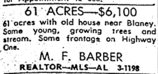 61 acres with old house near Blaney. Some young, growing trees and stream. Some frontage on Highway One.