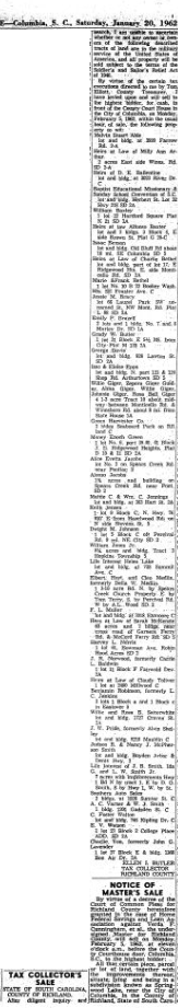 By virtue of the certain tax executions directed to me by Tom Elliott, County Treasurer. I have levied upon and will sell to the highest bidder, for cash, in front of the County Court House in the City of Columbia, on Monday February 5, 1962, within the usual hour, of sale, the following property to wit: