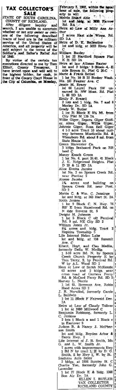 By virtue of the certain tax executions directed to me by Tom Elliott, County Treasurer. I have levied upon and will sell to the highest bidder, for cash, in front of the County Court House in the City of Columbia, on Monday February 5, 1962, within the usual hour, of sale, the following property to wit: